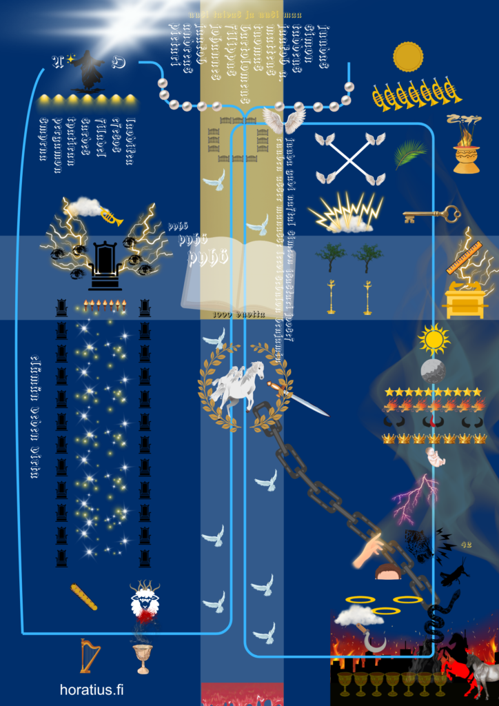 Kun ilmestyskirja kerta toisensa jälkeen ylitti ymmärrykseni, päätin että luen jatkossa jonkin aikaa pelkästään ilmestyskirjaa, että se avautuisi paremmin. Lukemisen apuna yritin visualisoida sitä paperille ja paperille tuherretun visuaalisaation seurauksena syntyi Canvassa luotu visualisaatio. Se ei ole missään nimessä täydellinen, eikä siinä ole tavoiteltu mitään muuta kuin sitä, että se olisi jonkinlainen visualisaatio, eli että siinä on tärkeimpiä elementtejä, jotka siihen voidaan mahduttaa ja että sen avulla ilmestyskirja voisi avautua paremmin. Syntyi mielenkiintoinen kuva, jossa elämän veden virta kulkee A:sta O:hon, alkaen seitsemälle seurakunnalle toimitetuista viesteistä, kulkien läpi valtaistuimen ja 24 vanhimman, sekä torvenpuhalluksien ja laskeutuen Babylonin tuhoon, josta taas nousten kyyhkysten ja valkoisten hevosten kanssa 1000-vuotiseen valtakuntaan, uuteen taivaaseen ja uuteen maahan, sekä uuteen Jerusalemiin jonka muurissa on kaksitoista nimeä, Karitsan kahdentoista apostolin nimet.